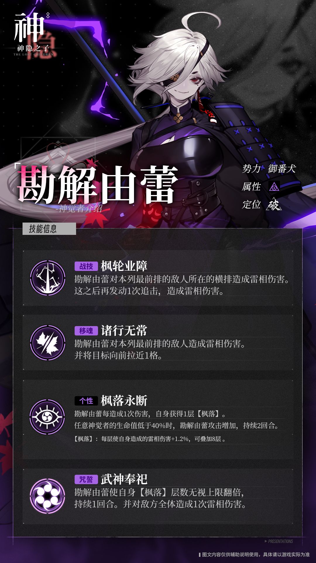 平日里神龙见首不见尾,不是白日在哪个小店饮酒,就是终日钻进山里打猎,令找不着她的部下头疼不已。小时候在寺庙中长大,有着“求道者”的一面。