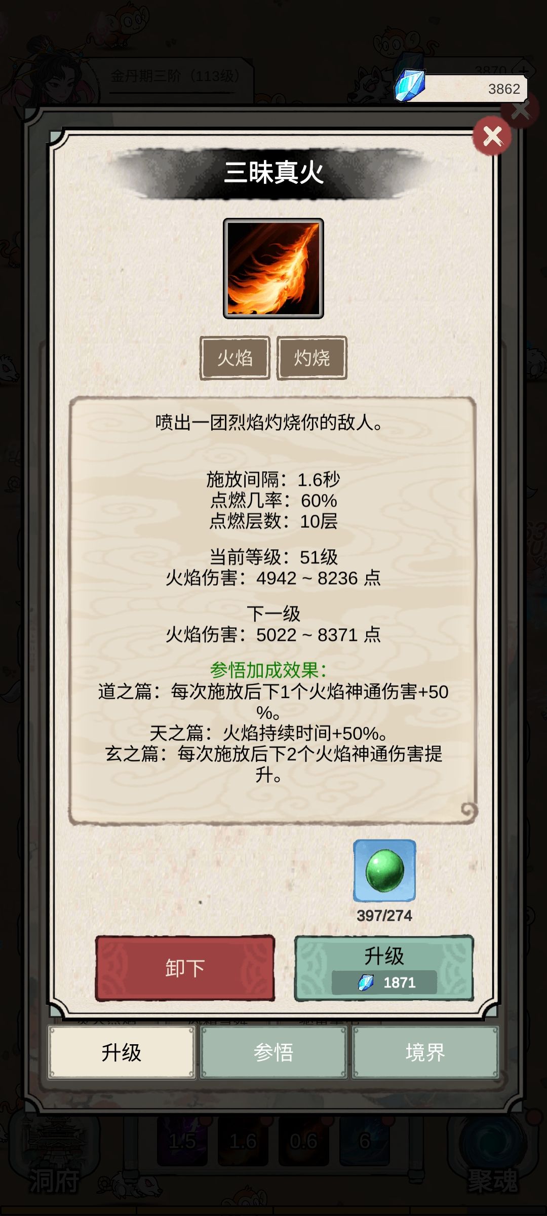 火系伤害最稳定,但是群体aoe伤害蛋疼且保命能力比较低,离火的伤害是所有技能里面最高的,1级增加144-176伤害,用来单点大妖和补刀很好用。三昧真火71级可以增加下两个火系技能的伤害100%,配合厉害单点补刀一流。