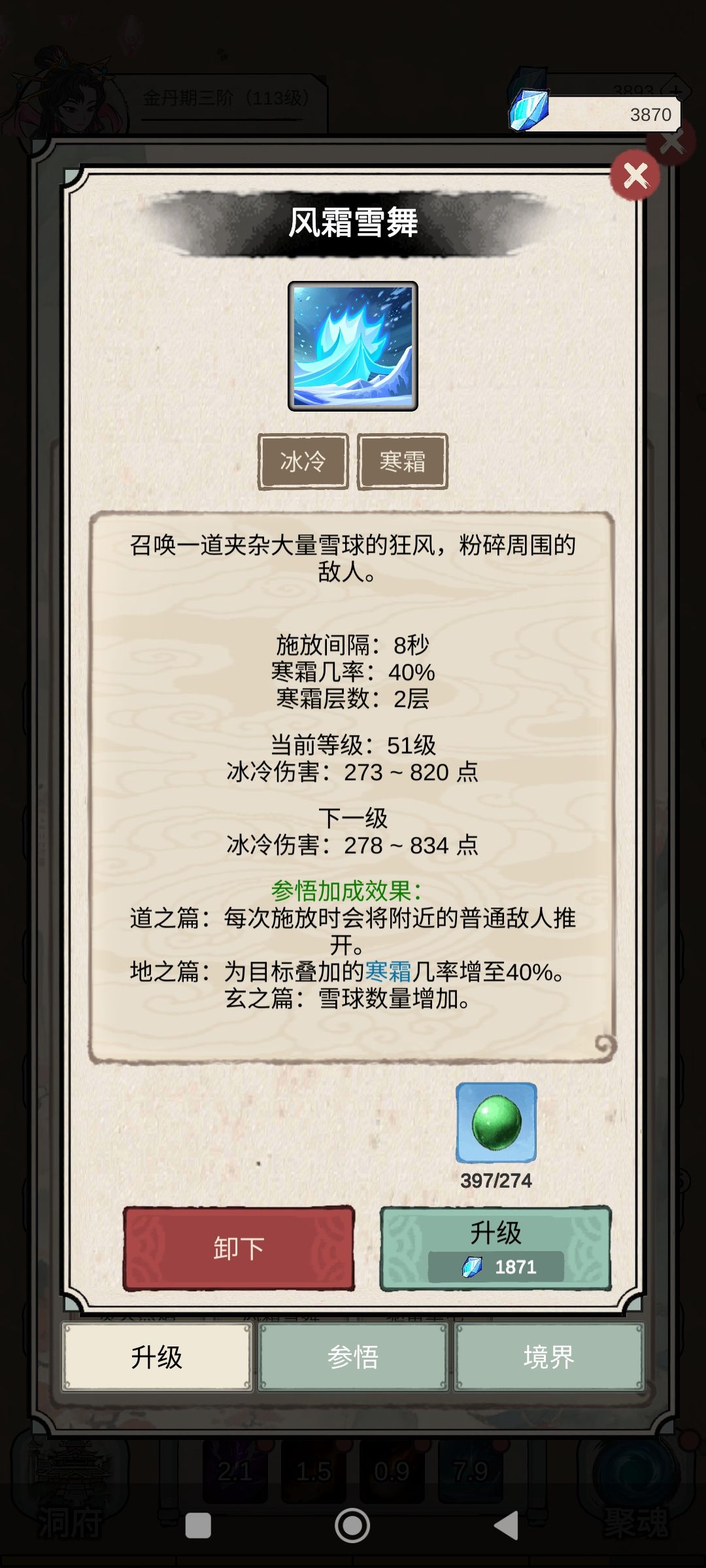 冰系护盾无敌,减抗减防,但是伤害基数太低了,清怪太慢。风霜雪舞是全屏穿透攻击,段数非常高,用来叠debuff非常好用,1级就能用,高级叠的更快。