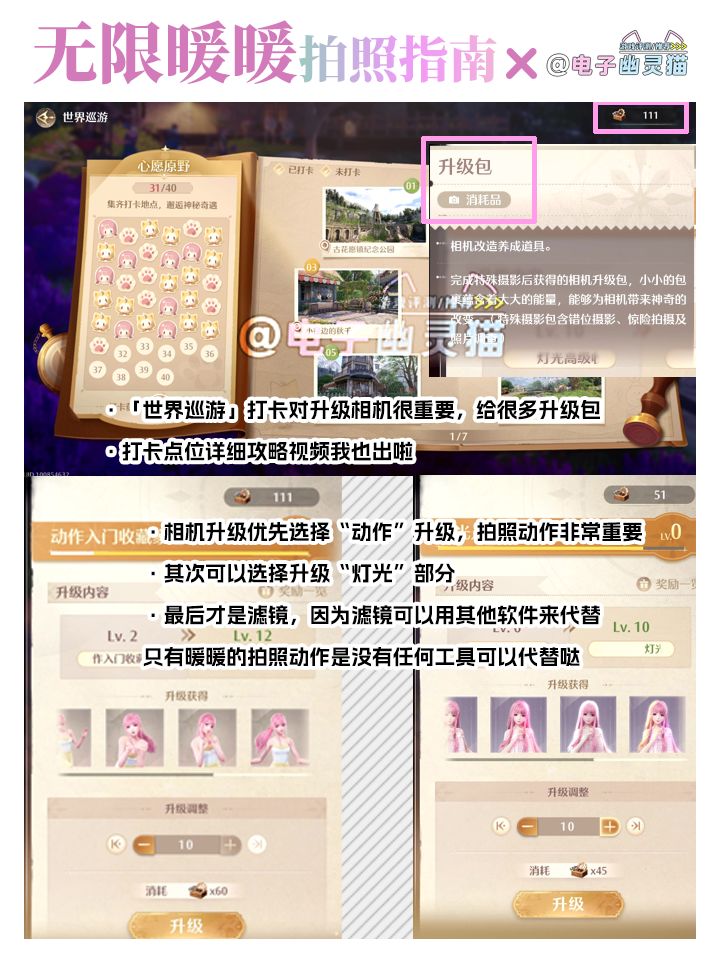 也可以在评论区贴上各位觉得拍的最满意的一张,看看大家都是去哪里取景哒(实不相瞒,是我馋各位搭配出来的漂亮女儿和美照了)~🌟猫猫这次想以图片的方式教大家相机升级包优先解锁什么好,以及拍照功能小技巧,方便各位拍出大片或者录制咱们暖暖美美的视频 vlog~