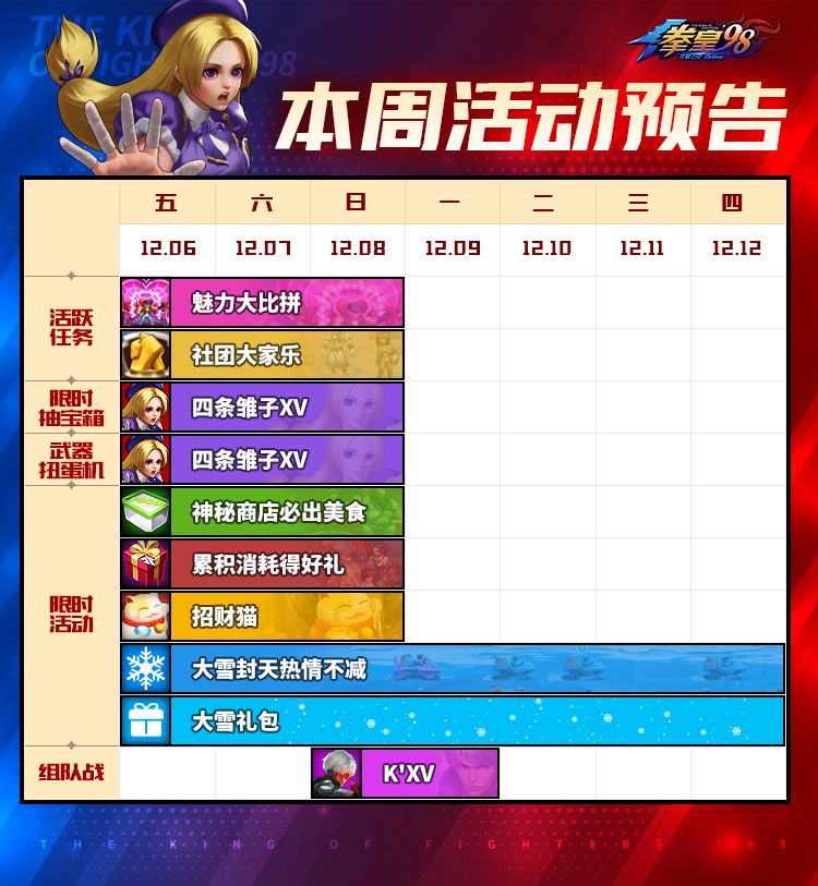 大家好!小舞又带来了本期的活动日历!大家猜本周的主题格斗家是谁呢?铛铛铛,那就是——四条雏子XV!不仅如此,还有魅力大比拼、社团大家乐等精彩活动,更多活动详情可以登录游戏查看~