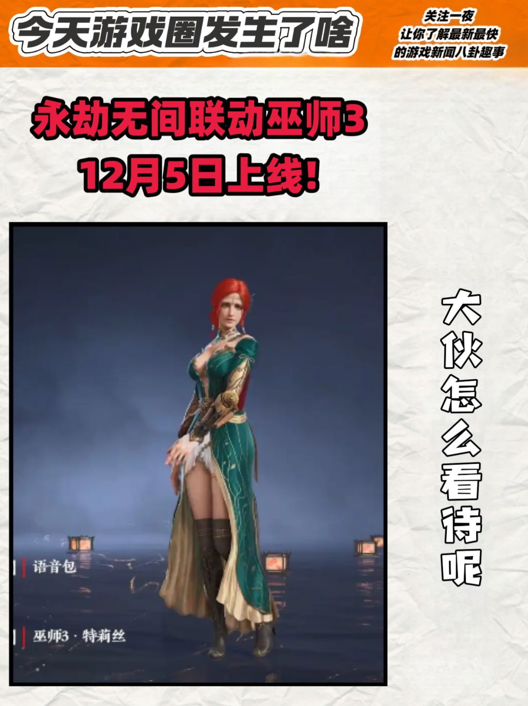 12月4日,《永劫无间》公布了与《巫师3》的联动CG和实机演示,联动预计将于12月5日上线,杰洛特、希里、特莉丝、叶奈法,4位《巫师3》中的经典人气角色,将分别作为季沧海、魏轻、席拉与崔三娘的外观进入永劫世界。其中杰洛特的外观可以免费获取,希里、特莉丝、叶奈法的外观需在商城购买。