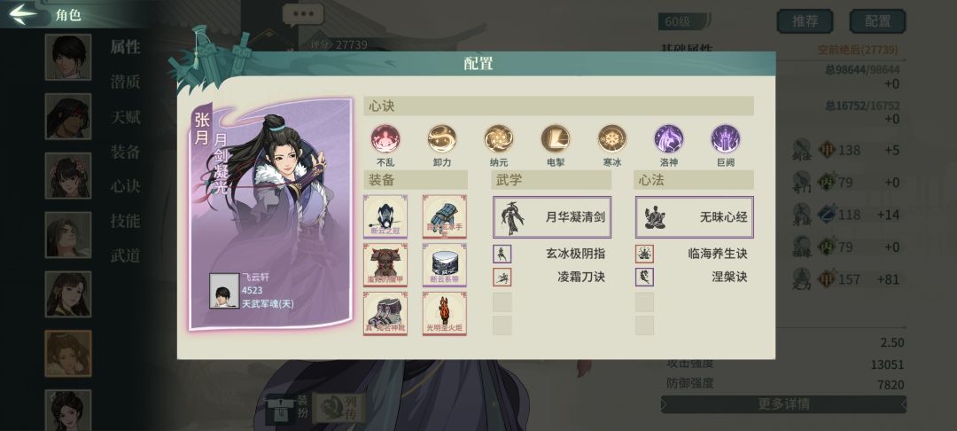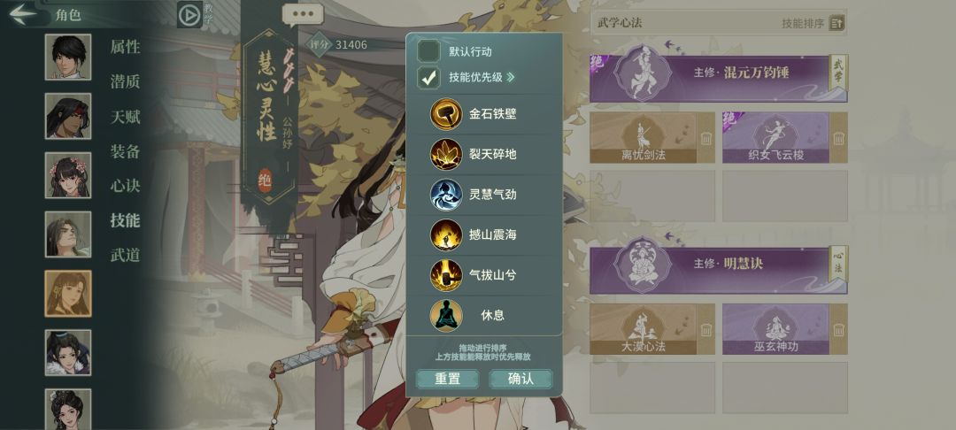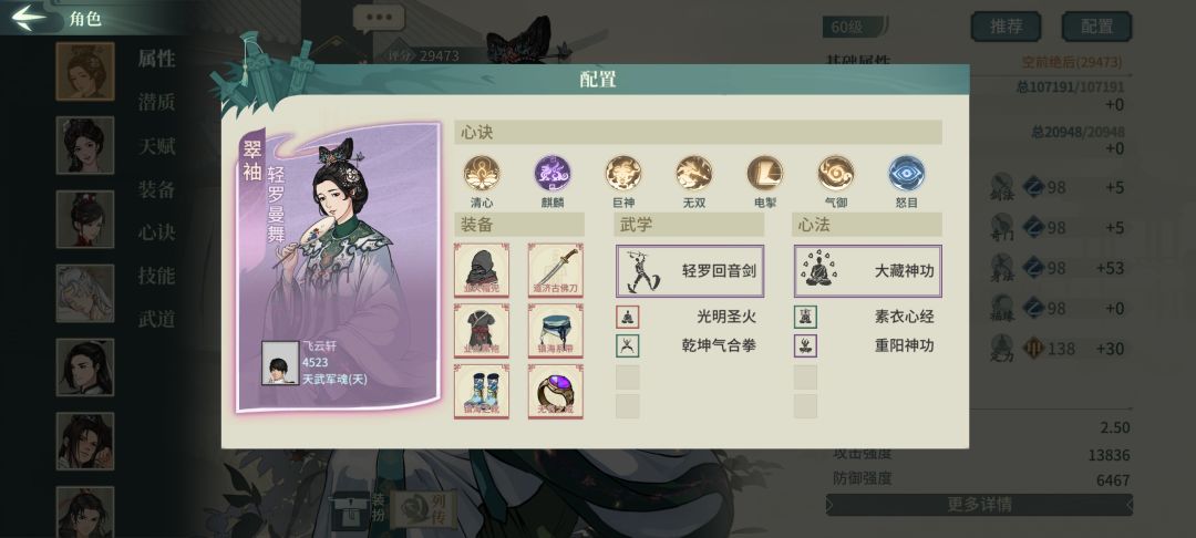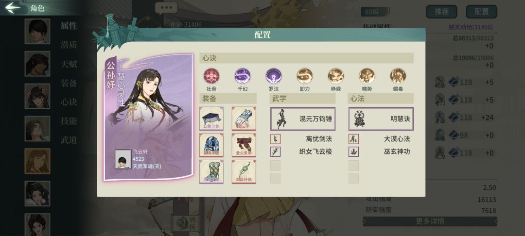 肉盾+控制位的公孙予,满潜能天赋负面穿透134%控制效果杠杠的。如果觉得还不够肉。可以把巫玄神功改成重阳神功。