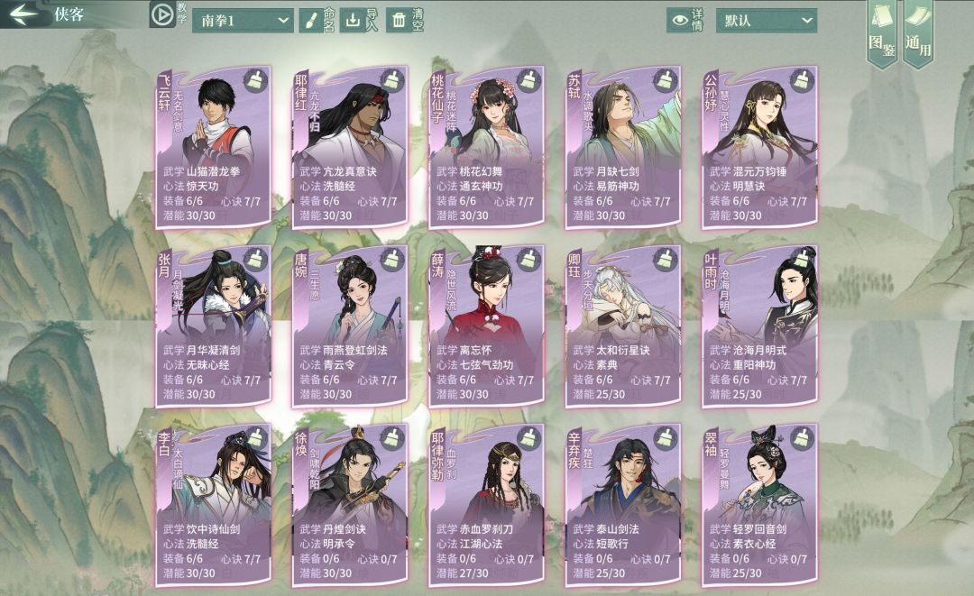 其次遇到辛弃疾藏渊侠客可以考虑上李白。我的侠客李白和老叶都是对策卡。其他都算主力和替补。除了苏轼是55减伤。其他都是基本满60减伤。还有苏轼用天机掌不用真天机掌因为他要降低攻击力。把大招给主角+其他侠客。比如带护心玉壁的糖丸,前排肉盾可以是耶律红、公孙予、唐婉,盾月。后排上桃花苏轼薛涛、遇到部分门派和侠客可以上卿珏锁头提前把对面的洪流侠客或者主角打死先。
