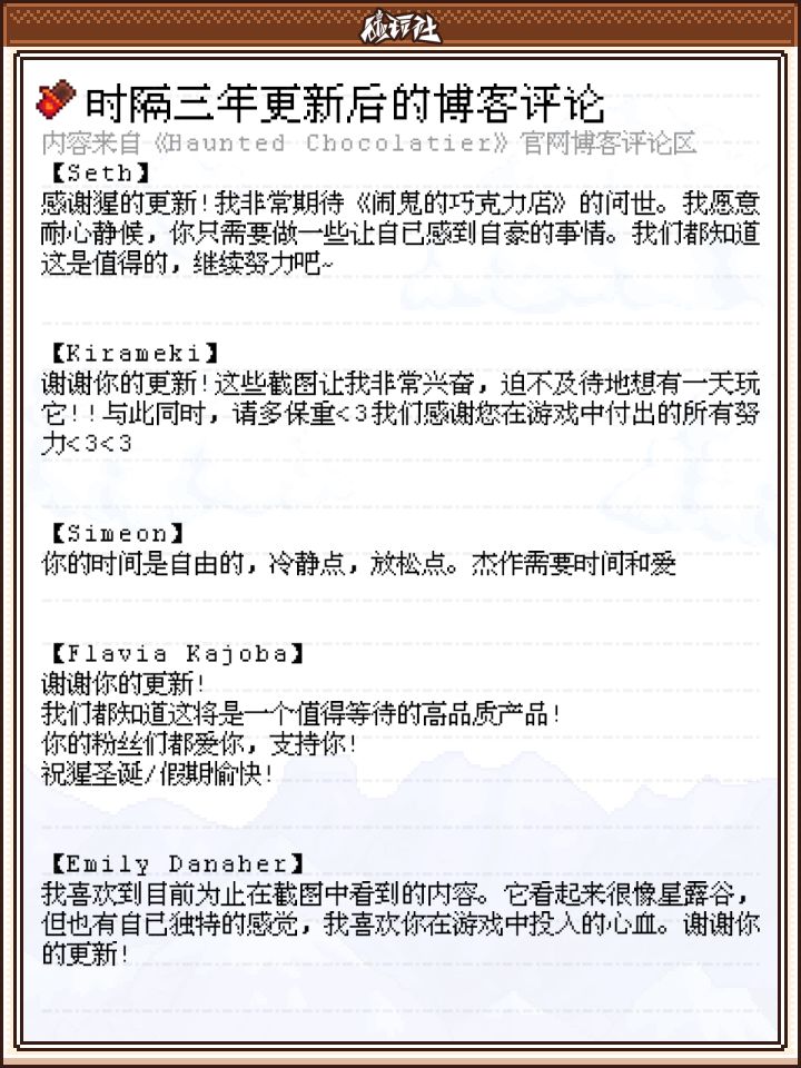 借此刚更新的“热乎”机会,与大家分享一些外国玩家对《闹鬼的巧克力店》的看法,不知道你是如何看待这款新作的呢~