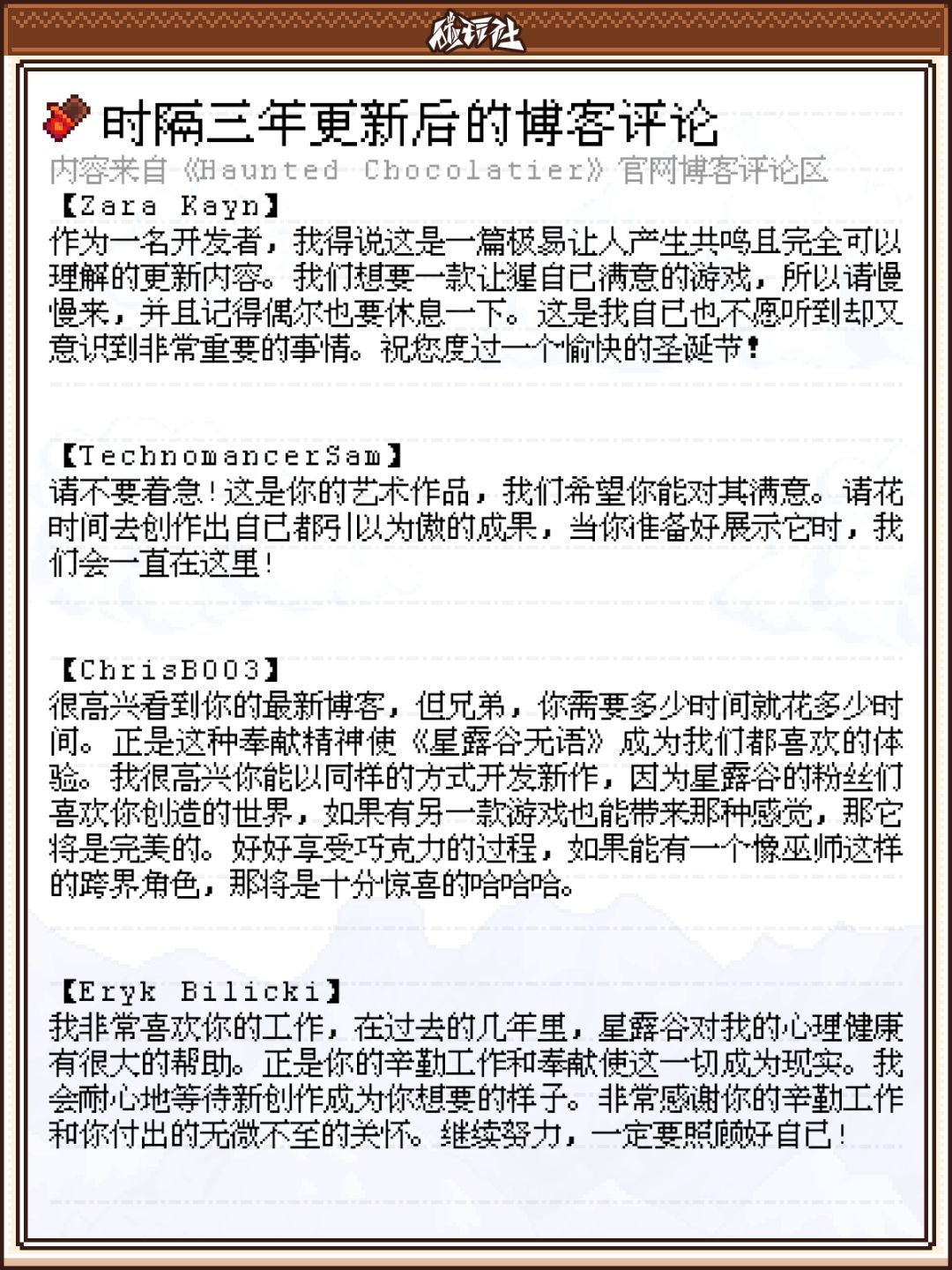 在2024年12月5日,星露谷作者ConcernedApe时隔近3年终于又发布了一则新作进展博客,在博客下方也有不少玩家发表评论,虽然支持的声音居多,但也有一些不满的声音。