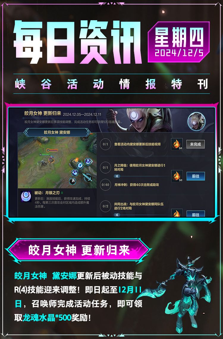 皎月女神 黛安娜更新后多项技能迎来调整。即日起至12月11日,召唤师完成活动任务即可获得龙魂水晶*500奖励~