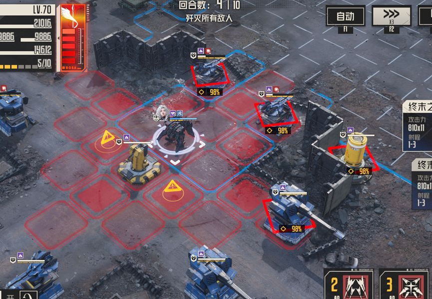 最后再动清理下面敌人,这里可以aoe或者浮游炮分别选目标,能消灭敌人即可