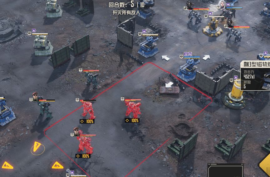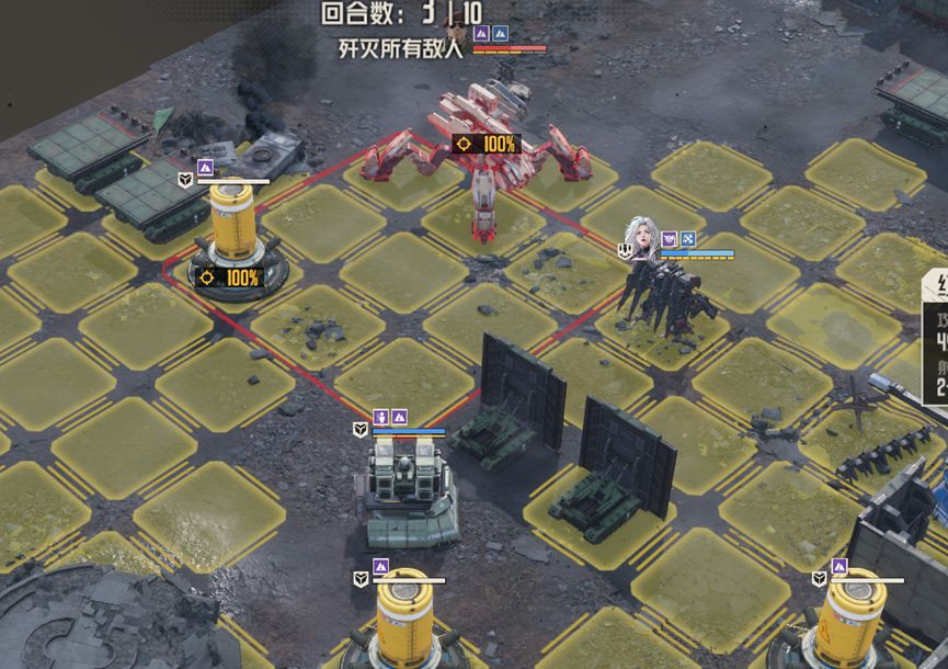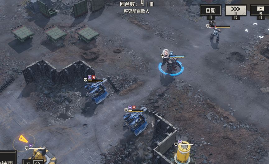 洛莎来中间待机,控制炮台攻击敌人。(有时候会残留一个敌人,这时候我们可以直接将其消灭,触发女武神再动来到中间待机)