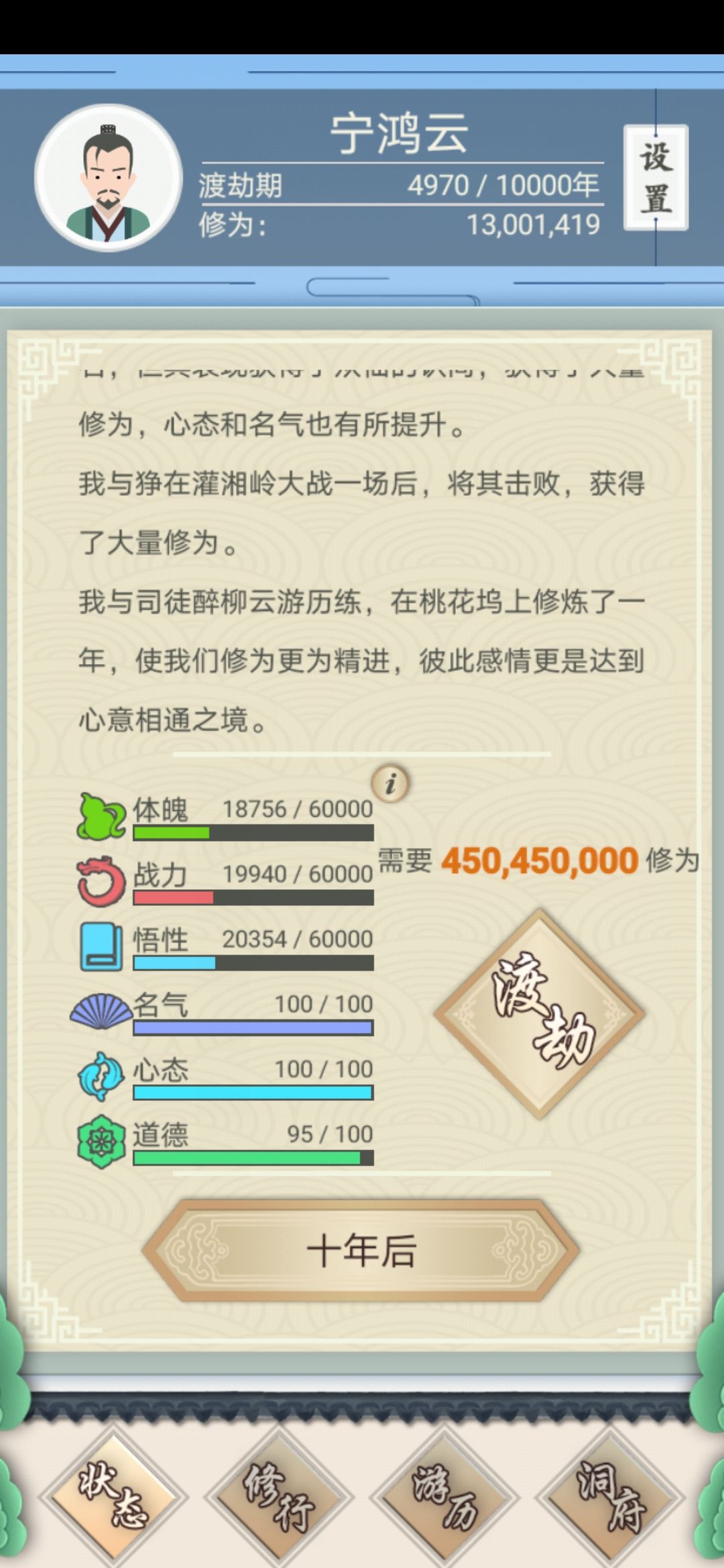 总结一下吧,就是肝肝肝!前期靠经商,后期靠种树,再后期靠每日点…奇遇先不说,因为打不过,战力永远比自己高几倍。突发事件选项固定,只要记住就没事。7百多万的时候儿子传功差点要了老夫的命!幸好苟住了,后面太无聊了