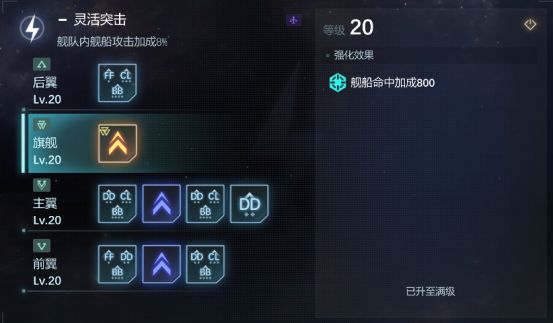 旗舰命中加成800,做为阵型中唯二加攻击属性的阵位,可以放一艘输出型舰船。