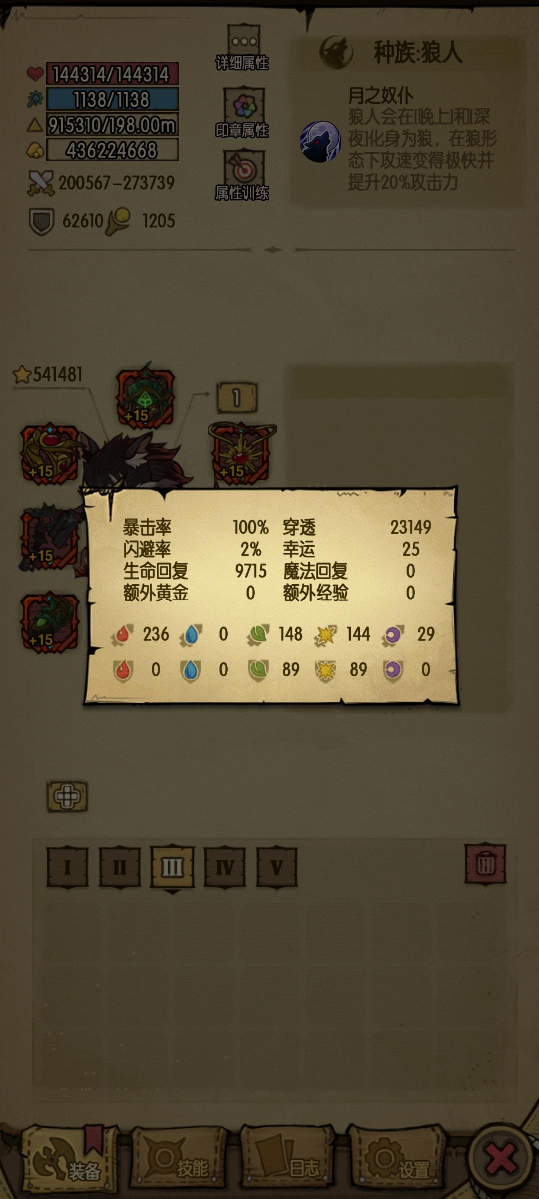 我还没有很彻底的更改装备,配置和狼人是同一套(狼人符纸带错成浣熊了,因为猴子带的也是浣熊)。猿神强度还是可以的,专属符文图纸比其他角色高出50%数值。伤害,猴子没穿透,狼人没专属的情况下,狼化的输出和猿神差不多,都是25次舍身一击能击杀七阶坑道虫,不过猴子要多普攻一下。下次把猴子穿透叠到两万四,狼人夜晚专属图纸看看区别。(狼人的实际攻击力要比截图少一万八最小攻击和三万最大攻击)