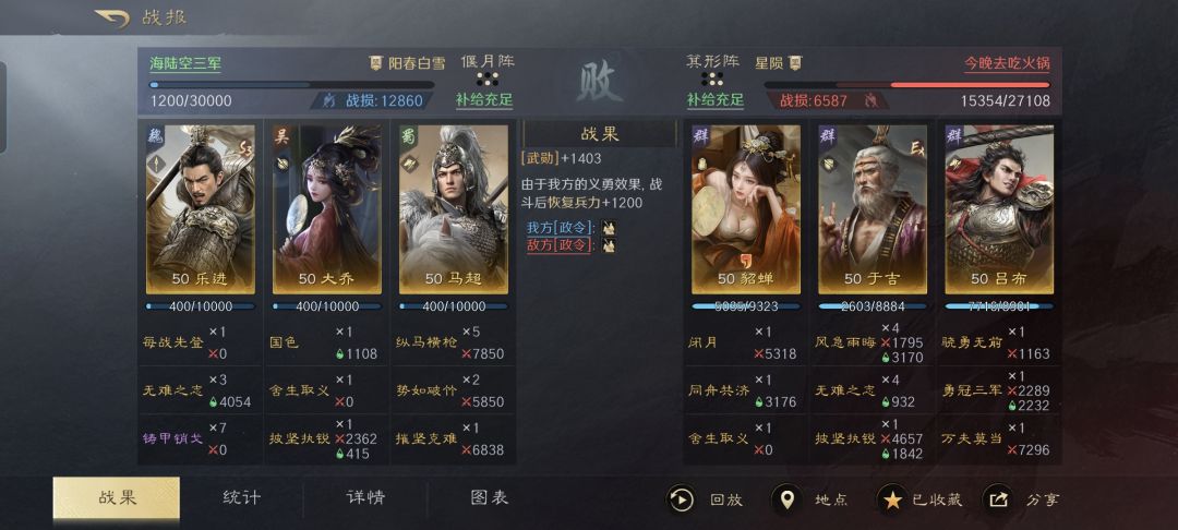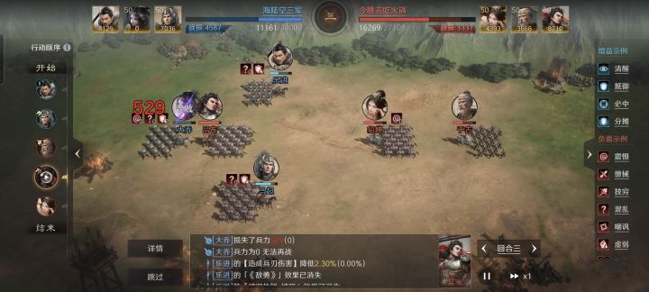 有一个细节值得注意,那就是貂蝉的专属金书离间,会让对面的马超跟自己人互撕,而且陷入混乱状态。貂蝉和于吉凭借后续习得的战法,总共给吕布提升了75%的连击率,使得己方的菜刀战力拉满,于吉的洪水降防也是帮了大忙。最终在吕布和对面马超的共同努力下,赢得了战斗。
