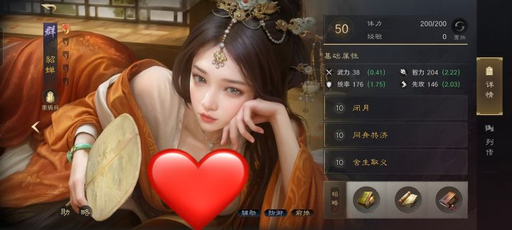 貂蝉的战法有,闭月、同舟共济和舍生取义。韬略库里,研读了离间、先勇善本和威帅善本。重盾兵特性不屈,专精点亮屹然不动。