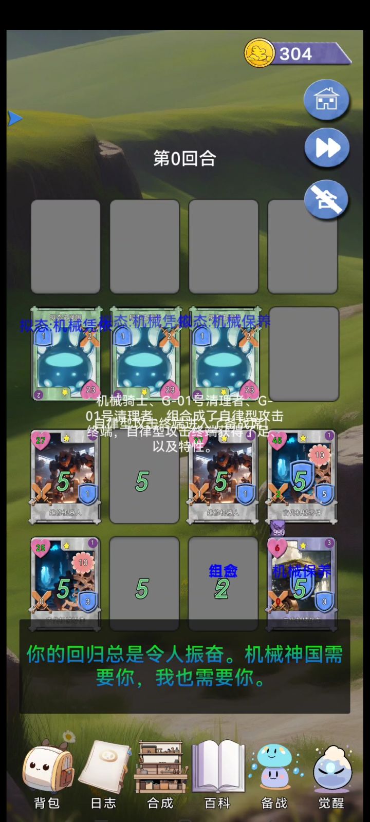 ②前期因为需要依赖对面的高伤害才能触发掉渣效果,所以伤害很难控制住,一般是先自己这边依靠几个维修机器人疯狂刷血,等到死斗回合双方每回合加伤,自己这边及时用维修机器人把对面清到只剩两只怪,然后解散这边的维修机器人,每次有攻击能力的机器人出现及时解散以防止自己这边攻击,当感觉零件血量不足时拖到后排恢复,然后后排留一个攻击机械清理掉对面,如果不好控制就用一倍速去操作。