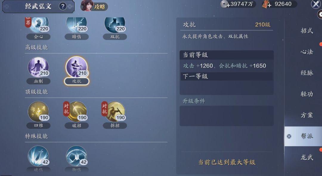 高级技能开放攻抗200-210级,消耗7万帮贡和2594万碎银,带来248点功力提升;顶级技能四维开放192-194级,总共需要消耗4.25万帮贡,带来51点功力提升。