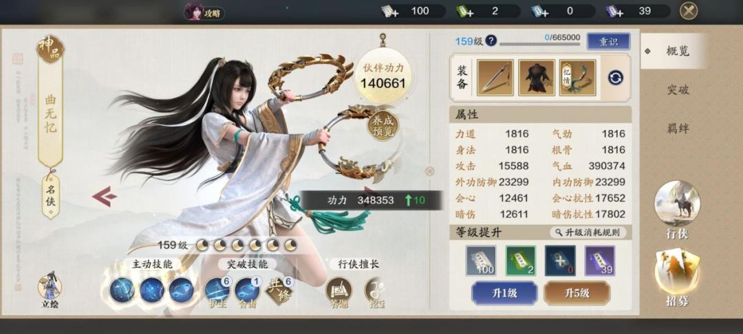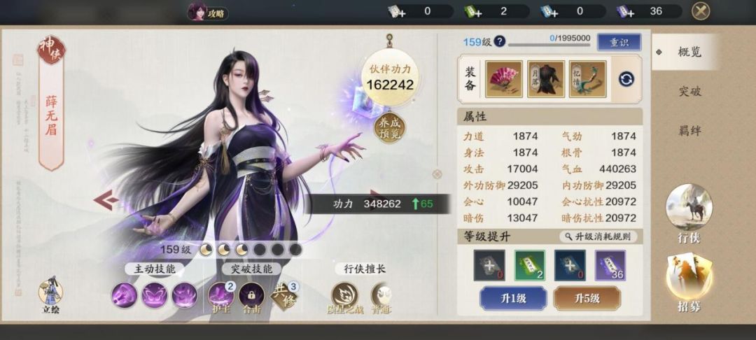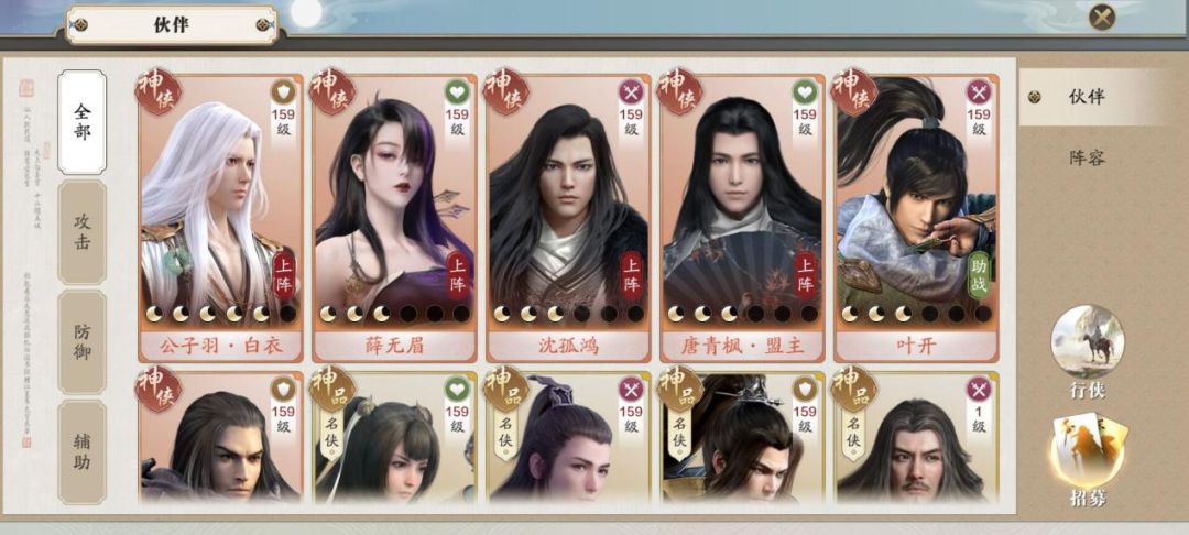 伙伴可以升级至159级,不同的组合带来的功力提升数值不同。公子羽/薛无眉:出战-64-65点功力、助战-13点功力;