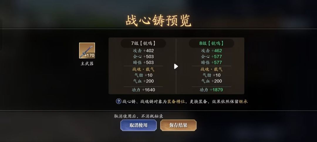 主武器八级战心铸开启兑换,需要1900胜负令,提升48-239点功力。升级后大家也可以装备天芒8级战心铸了。根据品级不同,提升的区间也不同。