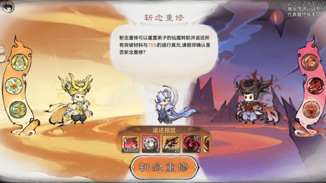 6、心法修行后可以通过“斩念重修”或“逆转仙魔”来改变弟子仙魔职业,前者有资源损失,但不需要特使道具;后者没有资源损失,但需要特殊道具;