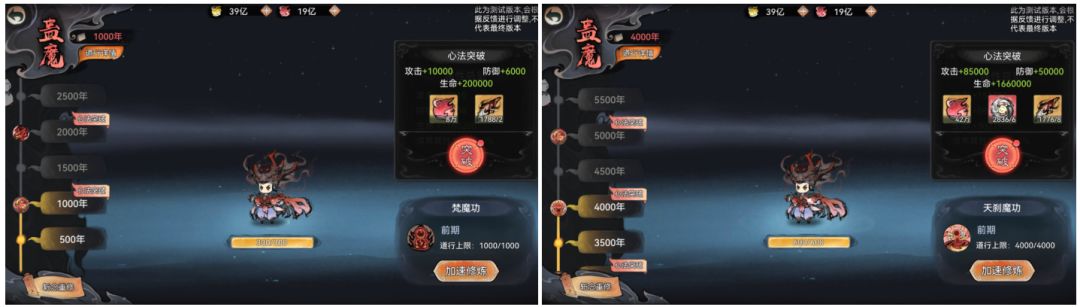 心法分为“仙术”和“魔功”两种,每种目前是有六阶,需要消耗特殊道具来解锁。