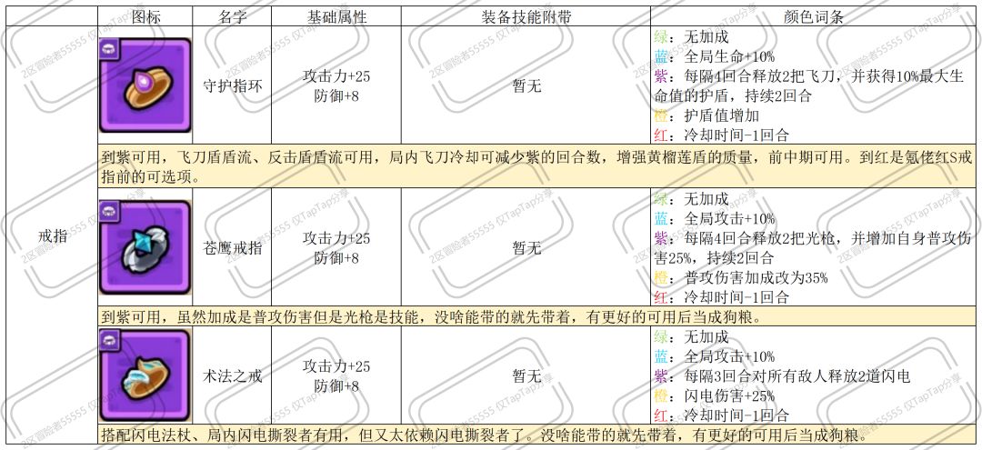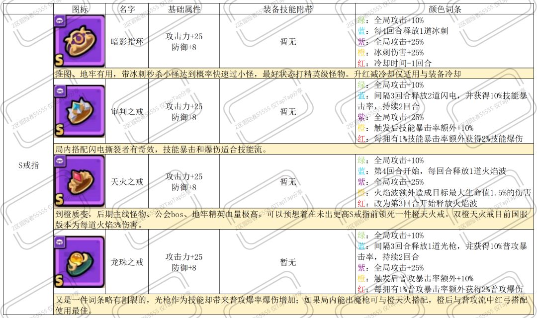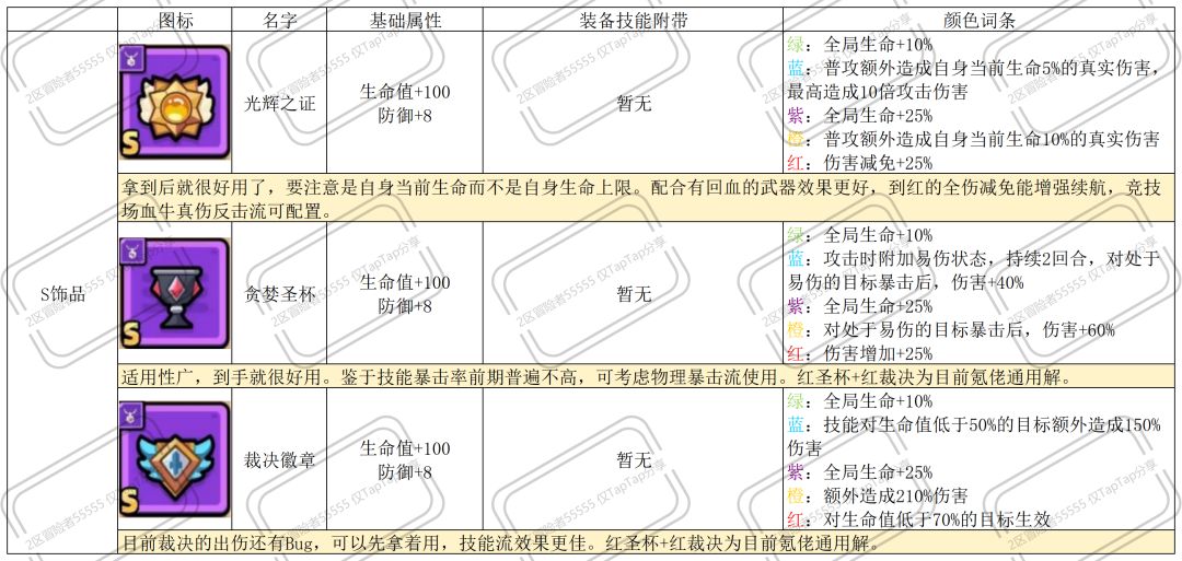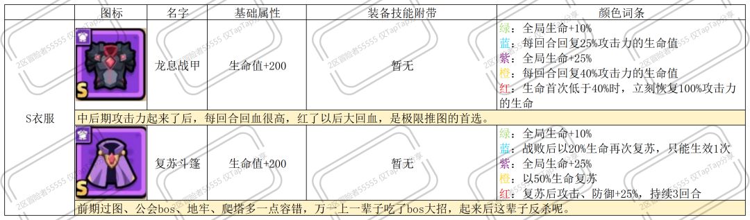 以下为非S的紫装,白绿阶段无词条加成,个别装备虽然没有标注S,但红后的合理搭配可视作超越S的存在。