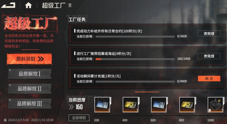 这个活动分为两部分,第一部分为原料获取,这里我们需要完成工厂任务,来获取积分,领取对应积分的奖励。笔者这里对奖励总数进行了统计,可以看到,奖励是比较丰厚的。