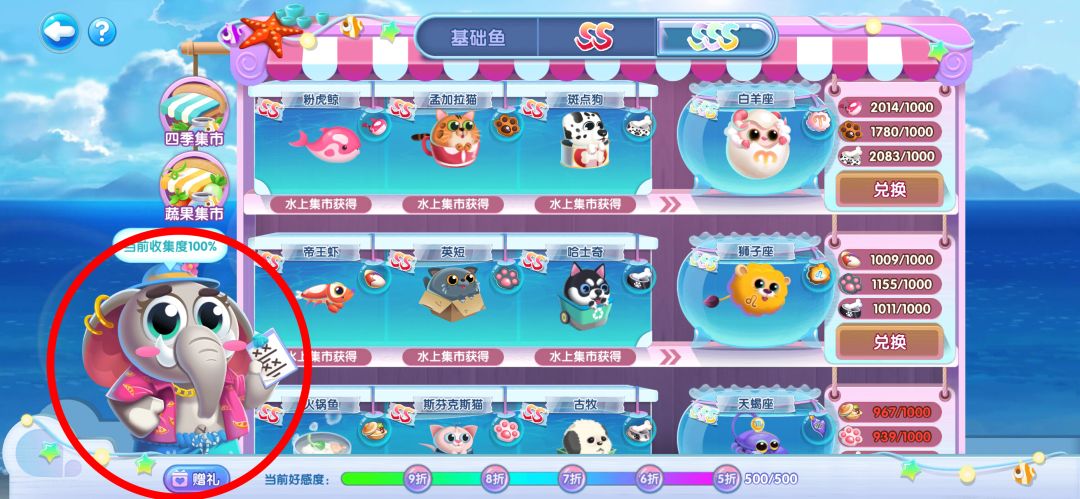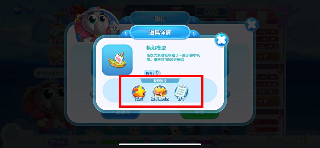 另外,细心的馆长可以已经发现集市下方的大象先生了,他可不是摆设,点击下方送礼,给大象先生送礼物便可以获取大象先生的好感度,当好感度达到一定的数量,换取集市上的鱼儿便可以打折啦。礼物获取方式可以在道具详情界面查看,途径有很多种,除了上面所列举的途径之外,出游的宝箱里面也都可以开出大象先生的礼物哦