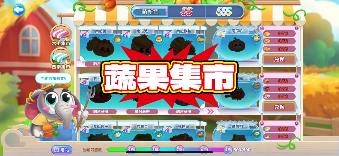 目前游戏中已经开放三种集市:水上集市、四季集市和蔬果集市