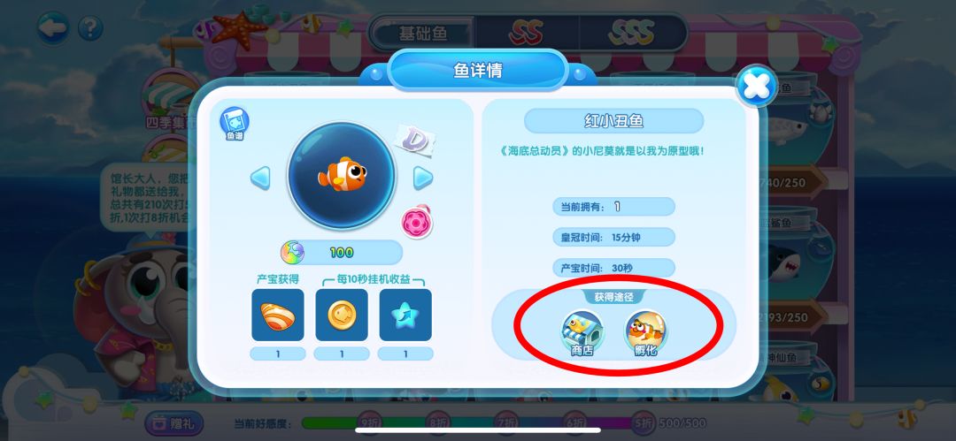 (着急的馆长可以使用加速剂加速成长)并且每个阶段的鱼儿都会产生一定的经验和金币,还有最重要的鱼宝。鱼儿在不同阶段所产生的效益也不尽相同,具体可由鱼详情界面查看,如下: