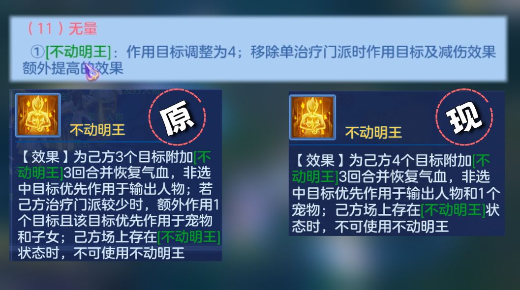 一方面,把不动明王的作用目标固定到了4个,移除了之前单治疗门派时,作用目标额外增加1个且减伤额外提高的设定;另一方面,非选中目标优先选择输出跟宠物,这倒是综合了下调整前的效果,整体没啥改动。