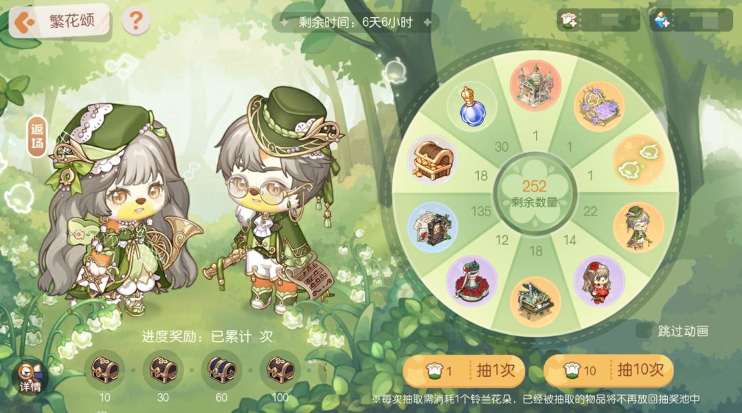 风儿的奇妙小花园限定开放,铃兰和蔷薇给奥比们送来珍贵的礼物!转盘包含小屋房型「铃兰礼堂」、时装「童话红蔷薇套装」「绮梦红蔷薇套装」「铃兰礼赞套装」「铃兰颂歌套装」和其他主题物品,活动期间消耗「铃兰花朵」可随机获取奖池物品哦!