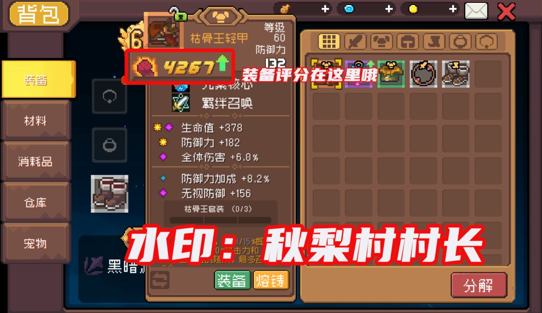 村长获得了一件枯骨王轻甲,该装备评分为4267,所以它只要减去3143就能变成1124啦,即:4267-3143=1124