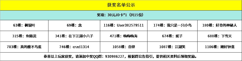 恭喜以下幸运的小骑士获得活动奖励,请中奖的小骑士添加获奖群:930986227,请加获奖群后,登记相关获奖信息,超过15个自然日未进群未登记视为放弃奖励~