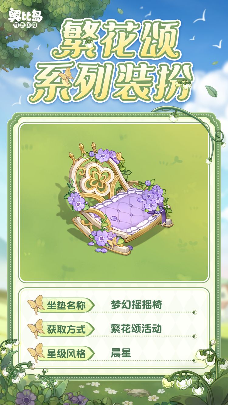 参与「繁花颂」限时活动,可获得活动限定奖励。奖励包括:辉月房型「铃兰礼堂」,晨星装扮「铃兰礼赞套装」「铃兰颂歌套装」,典藏装扮「绮梦红蔷薇套装」「童话红蔷薇套装」,晨星家具「铃兰音乐会系列」,典藏家具「红蔷薇花园系列」,还有双人坐垫「梦幻摇摇椅」、幻光「铃兰足迹」、头像框「铃兰花语」、背景卡「铃兰小调背景」等惊喜礼物!