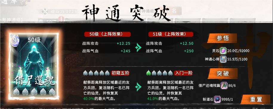 3. 新增神通重置功能,当神通升至50级及以上时界面会出现重置选项,可消耗1块斩道石重置神通等级,返还升级消耗的资源。