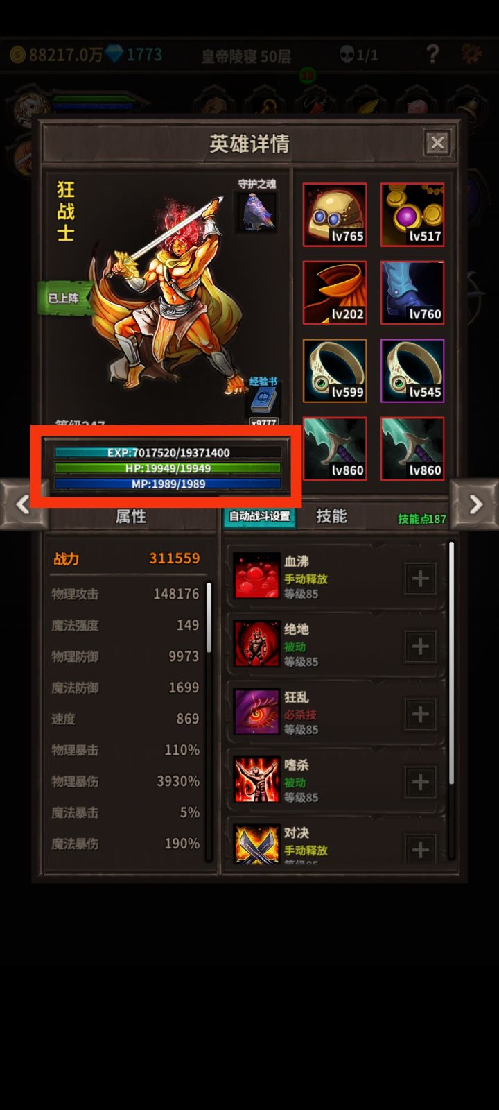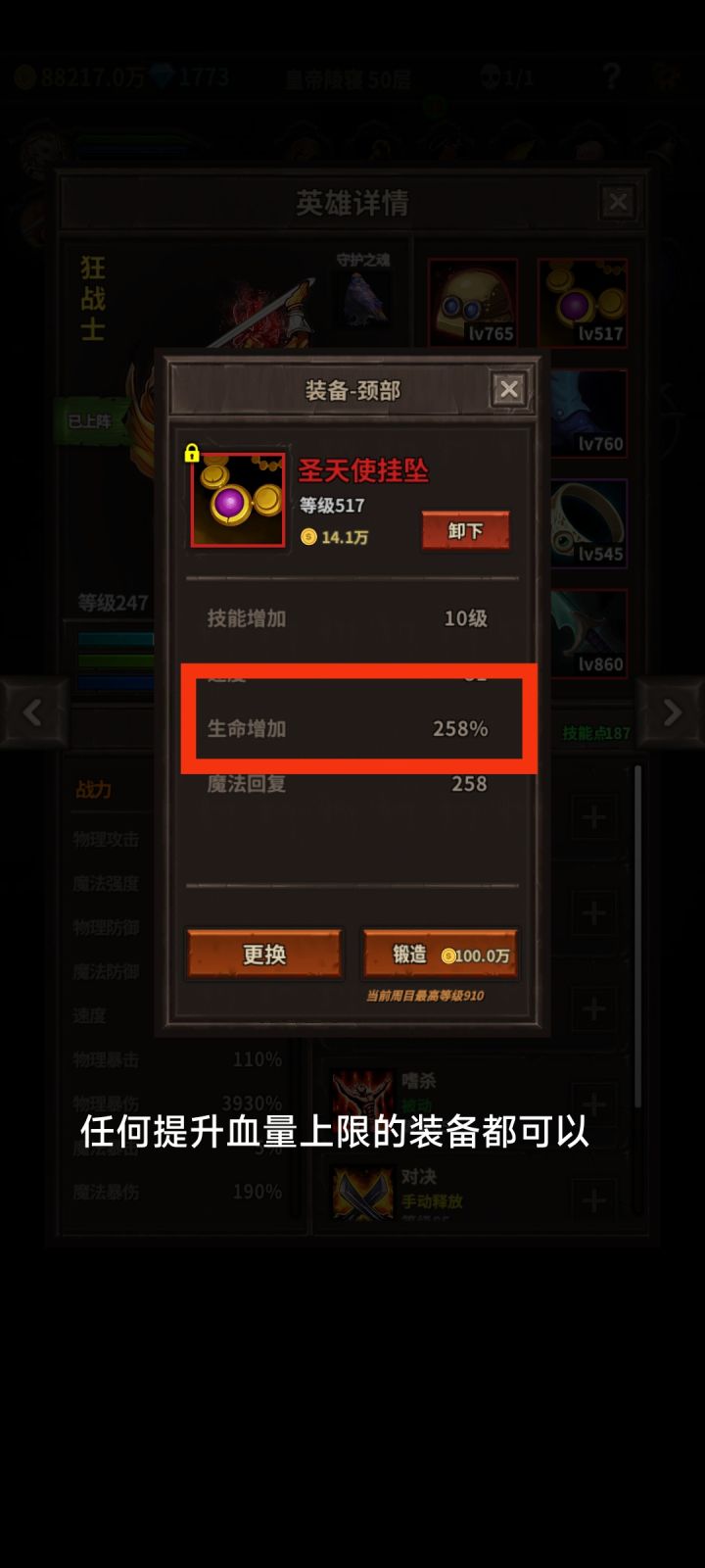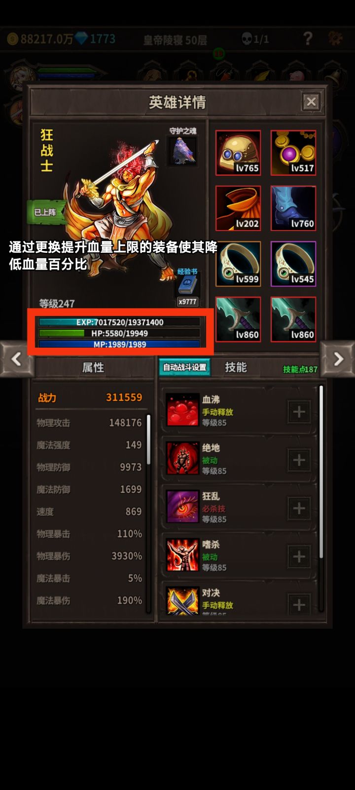众所周知狂战因为被动所以血量越低伤害越高,而装备的血量提升是可以通过重新装配来降低血量百分比的(装备词条的加上限≠加生命),因此我们可以通过这种方式来让狂战在打BOOS前就可以进入残血状态