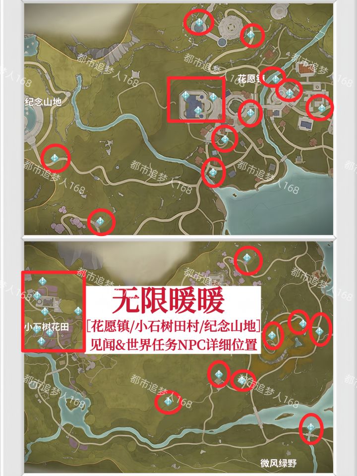 图一:[花愿镇/小石树田村/纪念山地]见闻&世界任务NPC详细位置!