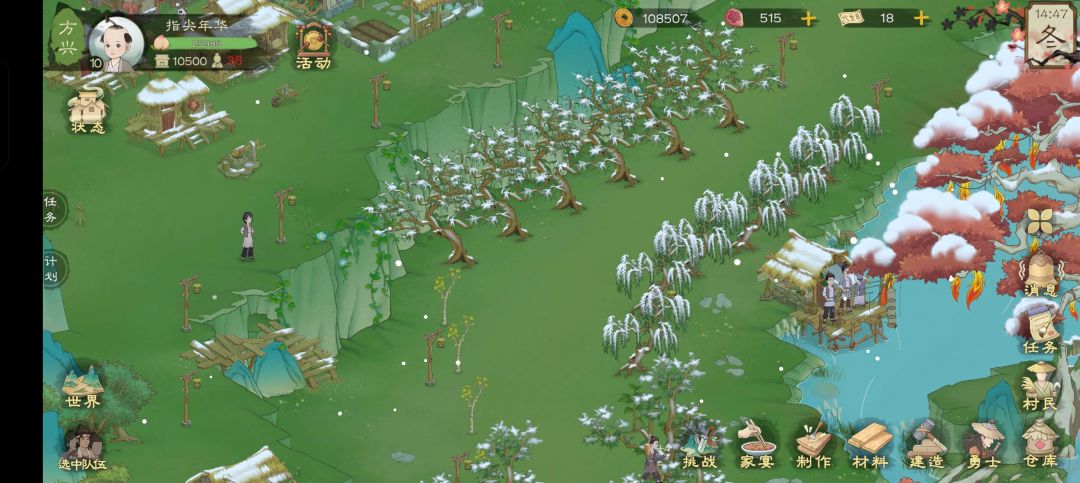 5、资源获取方面,合理安排村民,缺什么就采集什么,尽快提升等级开森林,森林有三个资源产出点,每个派一个村民就行了,铜币的话,提升鱼溪村声望等级到6000,可以获取银锭,金锭制作图纸,然后通过采集原材料制作,可以卖给杂货商,还有就是夜市有收购物品的,选最高价的,也能获得