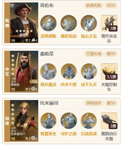 秦始皇和托米丽司要加一定敏捷抢速度,保证先手出手,尤其是托米丽司先手能给哥伦布加增减伤,非常重要。