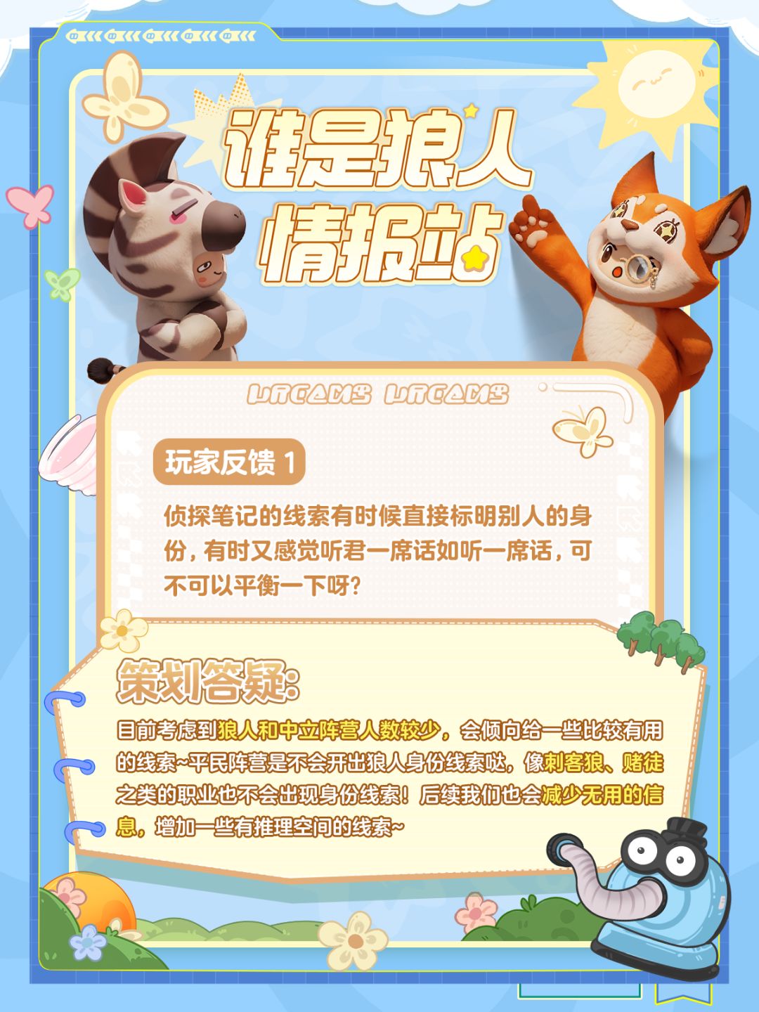 别急别急!星妹知道在体验了谁是狼人新身份和新地图之后,星宝们又积攒了一箩筐的问题,星妹立刻连线策划大大为大家答疑解惑!快向下滑,我们现在就开始吧!