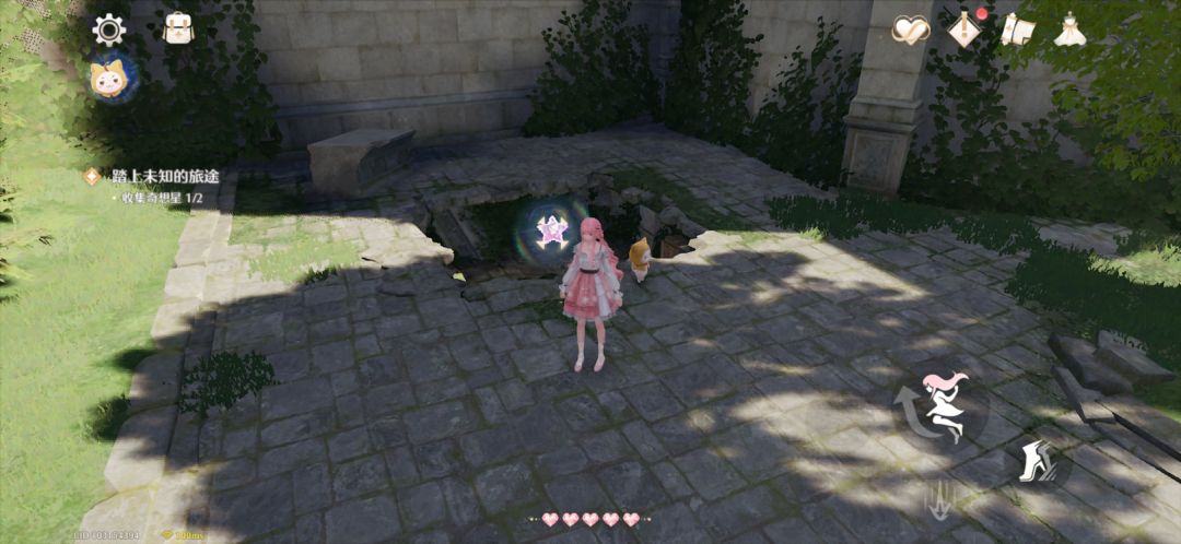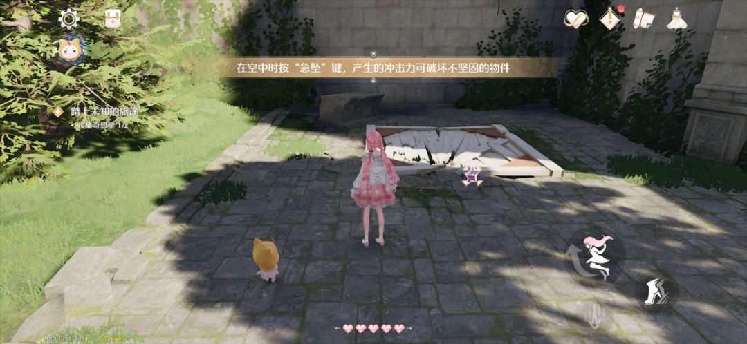 拿到第二颗星后向右转进去小花园。直走至花园尽头触发急坠教程,按两下跳跃按钮,再按急坠,打破木头,第三颗星就在下面的隐藏空间里,图3-5