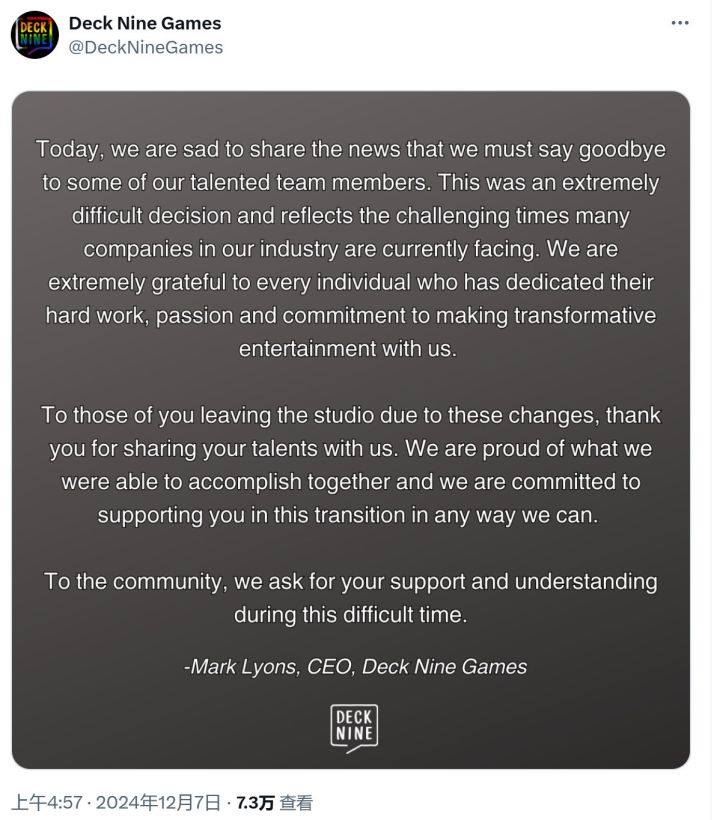 Deck Nine在X上写道:“今天,我们怀着沉重的心情宣布,我们必须和我们一些团队成员说再见。这是一个相当艰难的决定,反映了我们游戏行业很多公司正在面临的艰难困境。我们非常感谢每一位与我们一起努力、充满热情、致力于创造变革性娱乐的人。”