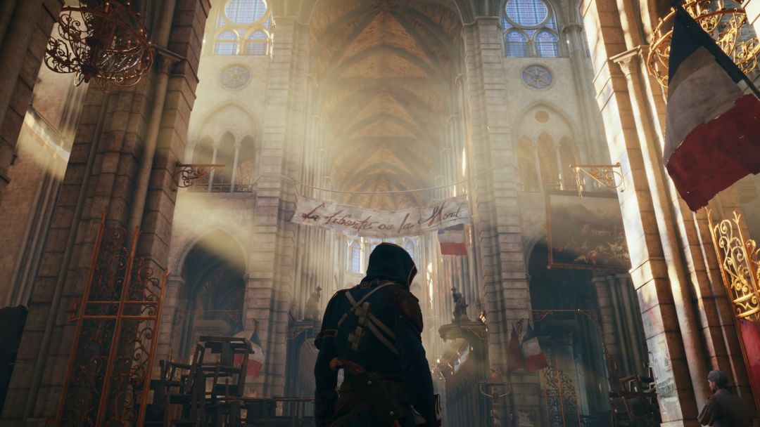 总之一切都是那么的惟妙惟肖,当然这也不得不提到这个最伟大的建筑建模之一,——巴黎圣母院。远看它是那样的壮观,辉宏。进到内部,光透过彩色玻璃与影交织在一起,不敢想象这样的画面在十年前摆在你的面前得有对么的震撼,不过值得注意的是,之前巴黎圣母院失火,修复时用的并不是这个《大革命》中的场景建模还原,因为它为了游戏性,进行了一定的改造。