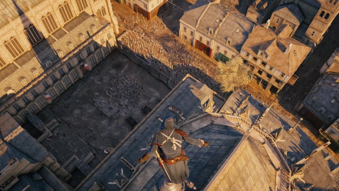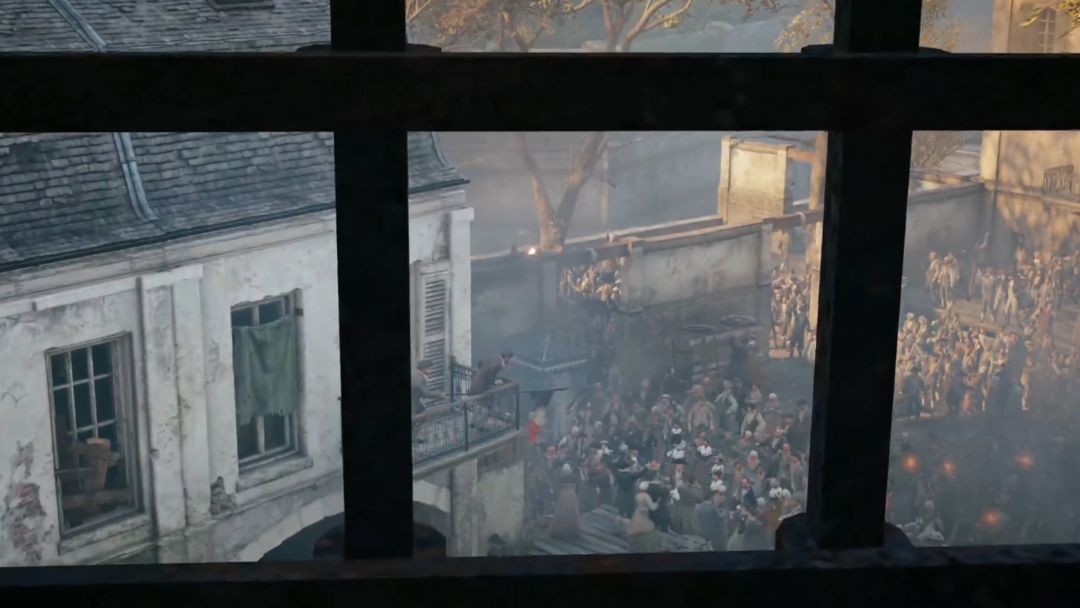 我之所以说它是最前卫也是最失败的作品,正是因为那壮观的巴黎圣母院,正是因为断头台前,千人同屏的震撼,这是你如今再难见到的场面,但却被十年前的育碧,展现在了眼前,游戏的副标题,大革命,也并不单单再指法国大革命这一历史事件,同样也是育碧的革命。但这是失败的,游戏在发售初期,充满了bug,甚至现在版本还时有发生,千人同屏的技术,也是榨干了当时的性能优化,令低配置玩家苦不堪言,当时的舆论,我感觉不亚于《赛博朋克2077》刚发售时的样子了,如同CDPR一样。前期的预告宣传有多震撼,后续跌落神坛的样子就有多狼狈。