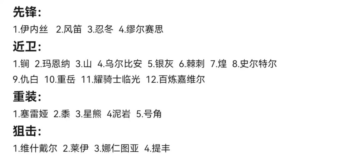 文章仅对干员进行简评,本期内容内容为:先锋、近卫、重装、狙击,索引如下