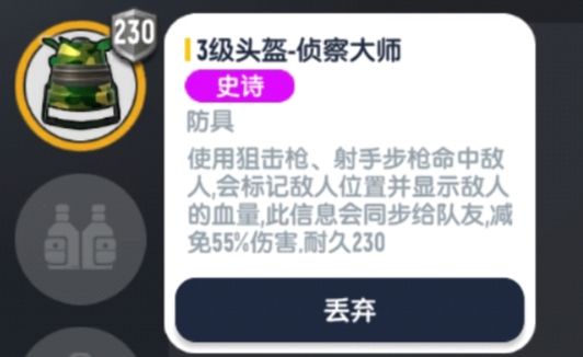 当我们拾取到[侦查大师]时,屏幕中间会提醒肠肠该头盔的辅助功能