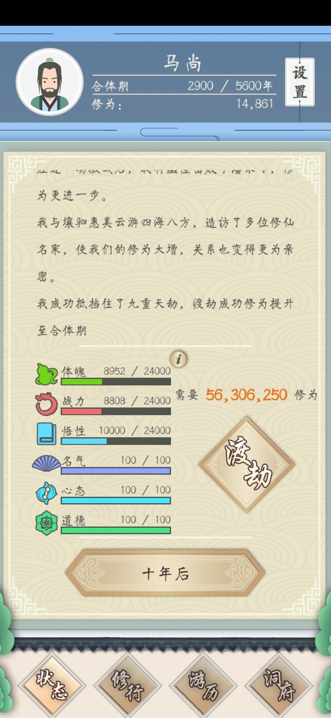 游戏初期没啥好说的,点点点就完了,修为主要获得方法是游历。