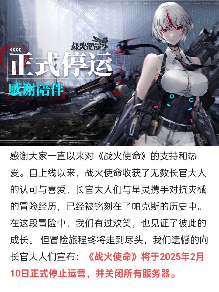 官方表示,游戏将于2025年2月10日正式停止运营,并关闭所有服务器。