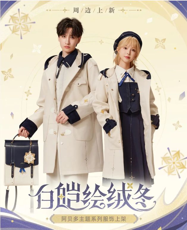 「阿贝多」主题印象服饰多款新品今天开售,包含:毛呢大衣、收腰衬衫、背带裙、休闲衬衫、休闲长裤、双肩包、贝雷帽、胸针。