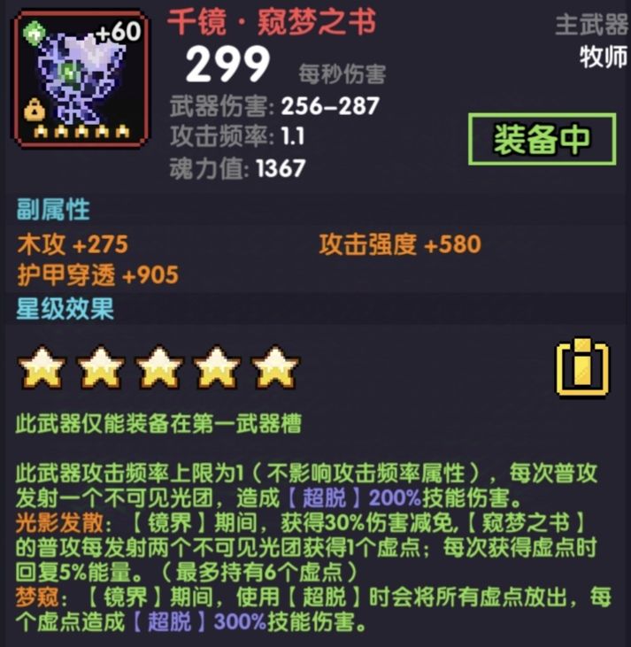 千镜·窥梦之书(魔女武器):护甲穿透+木攻+攻强/暴击值(暴击率不够洗暴击值)
